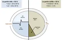 La composition idéale de la couche arable d'un sol agricole comporte en volume[30] : 25 % d'air, 25 % d'eau, et 50 % de solides (45 % d'éléments minéraux — argile, limon, sable —, et 5 % de matière organique)[31].