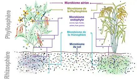 Le microbiome du sol est loin d'avoir été inventorié. En moyenne, un tiers de la biomasse des plantes est sous terre sous forme de racines mycorhizées. Au total, un sol de champ abrite une dizaine de tonnes de biomasse souterraine vivante par hectare (l'équivalent d'un petit troupeau de vaches), qui se répartissent en trois à six tonnes de racines mycorhizées, 3,5 tonnes de champignons, 1,5 tonne de bactéries et 1,5 tonne d'animaux[12]. Au bilan, la matière organique des sols représente entre 50 et 75 % de la biomasse vivante des écosystèmes terrestres, et entre 60 et 90 % de leur biomasse totale (vivante ou morte)[13]. | ||