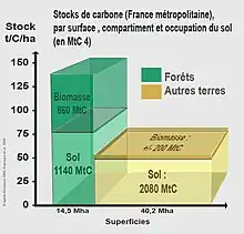 La perte de la matière organique du sol dans les systèmes d'agriculture intensive[46] participe à l'émission de dioxyde de carbone dans l'atmosphère, principal gaz à effet de serre dont l'augmentation de la concentration est l'un des facteurs à l'origine du réchauffement climatique. « Des études, menées en Inde et en Australie, ont pu montrer que, sous la végétation forestière naturelle, le contenu en matière organique atteint un état stationnaire au bout de 500 à 1 000 ans de fonctionnement de l'écosystème. Tout défrichement à des fins de culture entraîne de 23 à 50 % de perte de carbone organique du sol[47] ». Pour stopper cette perte de carbone qui altère la durabilité de la production agricole et menace la sécurité alimentaire, et cette augmentation de la concentration de CO2 qui affecte le climat[48], la France présente en 2015 lors de la COP 21, un projet international de séquestration du carbone dans le sol, dénommé « 4 pour mille », et qui « consiste à accroître chaque année le stock de C dans les 30 premiers cm des sols de 0,4 % (quatre pour mille), et ce à l'échelle planétaire[49] ».