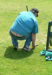 Un golfeur s'accroupissant, laissant apparaître un sourire du plombier.