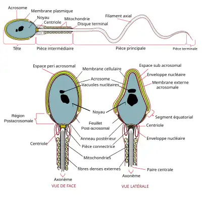 Chaque spermatozoïde comprend un noyau, un système de locomotion (généralement un flagelle) et une vésicule nommée acrosome, riche en enzymes, qui lui permettront de pénétrer dans l'ovule. Le spermatozoïde est motile, il peut se déplacer par ses propres moyens, contrairement à l'ovule.
