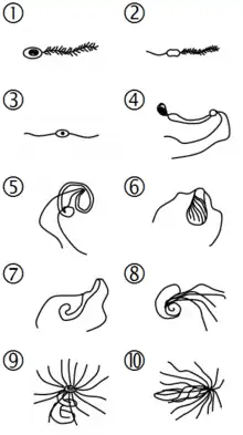 « Quand ils nagent, leur queue ondule comme un serpent ; ils sont comme des anguilles dans l’eau », écrivit Antoni van Leeuwenhoek (1632-1723), lors des premières observations de spermatozoïdes humains. Cependant l'animal dont la nage évoque le mieux celle des spermatozoïdes humains, c’est: la loutre[2]. Cet animal aime à tournoyer, batifoler tout en nageant avec agilité. Le , une équipe internationale de chercheurs, des universités de Bristol et de Mexico, ont mis en évidence que le flagelle du gamète mâle, au lieu d’osciller symétriquement, ondule toujours du même côté, dans un mouvement complexe[3]. Le flagelle s’enroule sur lui-même à mesure qu’il avance, cela permet au spermatozoïde humain de ne pas tourner en rond. Ainsi, dans le système génital féminin, il peut atteindre la vitesse de 2 à 6 millimètres par minute, selon les estimations réalisées à partir d'une modélisation mathématique. « Cette étude met en évidence que le flagelle du spermatozoïde (humain) est équipé de mécanismes de régulation complexes qui lui permettent de nager. » (Hermes Gadêlha et al., 2020)