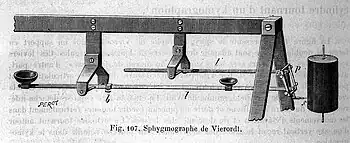 Un sphygmographe était un instrument de mesure mécanique utilisé au milieu du XIXe siècle pour enregistrer le pouls. Développé en 1854 par le physiologiste allemand Karl von Vierordt, cet appareil, inspiré du sphygmomètre de Hérisson (1834) et du Kymographion de Ludwig (1846), est considéré comme le premier dispositif externe, non intrusif, utilisé en dehors du cadre expérimental pour mesurer la pression artérielle[1],[2]. Il fait partie des nombreux appareils explorateurs construits à la même époque destinés à prendre le mouvement des organes : cardiographe, laryngographe, myographe, pneumographe, pnéographe, etc.