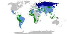 Au  : en vert foncé se trouvent les pays qui ont commandé des millions de doses de Spoutnik V ; en vert clair, les pays qui ont manifesté leur intérêt pour l'obtention du vaccin ou qui le testent déjà.