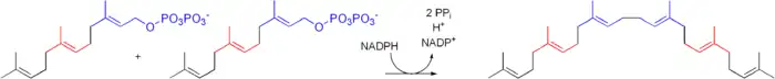 - Deux molécules de farnésyl-pyrophosphate se condensent après réduction par le NADPH pour former du squalène - sous l'action de la squalène synthétase.
