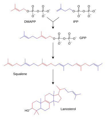 Le squalène est le précurseur biochimique de toute la famille des stéroïdes[11] : c'est l'oxydation (via une enzyme, la monooxygénase squalène) de l'une des extrémités de la molécule de squalène qui produit par cyclisation, catalysée par des enzymes, le lanostérol, lequel sera transformé en cholestérol et en d'autres stéroïdes.
