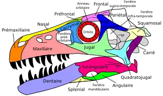 Crâne de Dromaesaurus. Le squamosal est en jaune pâle.