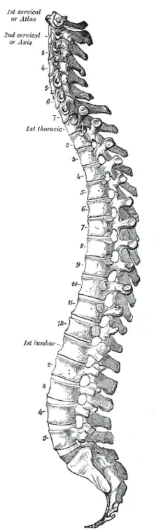 La colonne vertébrale est une longue tige ostéo-fibreuse, pleine en avant, creusée d’un canal en arrière, située sur la ligne médiane à la partie postérieure du tronc. Elle est composée des vertèbres, séparées par des disques fibrocartilagineux. Dans le plan frontal, elle est droite alors que l'on décrit volontiers des courbures dans le plan sagittal. On distingue :