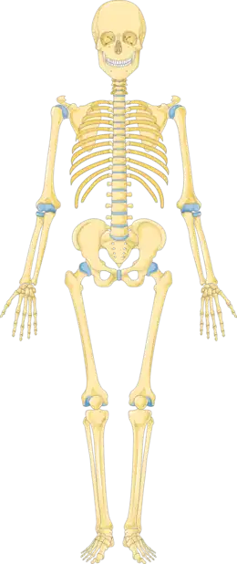 Squelette axial, squelette appendiculaire, os humain (d), osselet de l'ouïe, dent, cartilage du nez, cartilage de l'oreille externe (d), cartilage laryngé (en), colonne vertébrale humaine (d), thoracic skeleton (en), os du membre supérieur (d), os coxal, os du membre inférieur (d), articulation, articulation du membre supérieur (d), articulation du membre inférieur (d) |