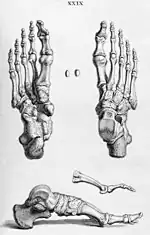 Le Pied comprend le tarse, le métatarse et les phalanges des orteils. Le tarse réunit 7 os courts, disposés en deux rangées. La rangée postérieure est formée de deux os superposés, le talus (« astragale ») et le « calcanéum » (calcaneus). L’antérieure est constituée en dehors par le cuboïde, en dedans par l'os naviculaire et les trois cunéiformes. L’astragale est irrégulièrement cubique. Elle présente, à sa face supérieure, la poulie astragalienne convexe dans le sens antéro-postérieur et concave transversalement. Plus large en arrière qu’en avant, elle s’articule avec la face inférieure de l’extrémité inférieure du tibia. Le calcanéum est l’os le plus volumineux du tarse.