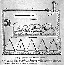 Pour les bébés prématurés, il a aussi imaginé la couveuse ou incubateur. Il aurait eu l'idée en regardant des couveuses pour oiseaux exotiques du jardin d'acclimatation de Paris en 1870. Cette idée est appliquée à partir de 1880 à la clinique qui portera son nom[3]. L'incubateur de Tarnier est une caisse en bois munie de réservoirs d'eau chauffée par une lampe à alcool, où l'enfant est maintenu dans une atmosphère de température à peu près constante de 37° C[11].