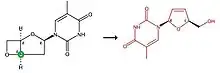 La stavudine ou D4T fut synthétisée pour la première fois par le scientifique américain Jerome Horwitz dans les années 1960 par rupture de la liaison entre le carbone entouré en vert et l'oxygène. L'alcool primaire correspondant, la stavudine, est ainsi formée.