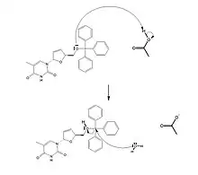 Mécanisme de dé-protection : l'acide acétique permet de protoner l'oxygène lié au groupement triphénylméthyle (cet oxygène se charge positivement), puis l'eau attaque l’atome de carbone central du groupement triphénylméthyle. Le triphénylméthanol est ainsi libéré.