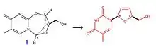 La molécule de formule brute C10H12N2O4 (correspondant au composé numéro 1) est un exemple de molécule pouvant servir à synthétiser du D4T en passant par un réarrangement structural. Cette molécule est d'abord mise en présence d'un sel d'imidazolium (à 50 °C), puis réagit avec NaH dans des conditions particulières (température de 100 °C, pendant 5 min), et forme ainsi la stavudine.