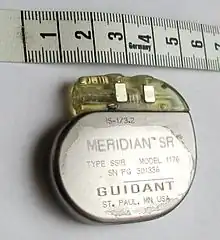 - d’une source d’énergie (une batterie fonctionnant au lithium-Ion). Elle n'est pas rechargeable (le boîtier en fin de vie doit être remplacé lors d'une opération chirurgicale). L'avantage de ce type de batterie est sa durée de fonctionnement prolongée, avec une baisse progressive de la tension qui permet d'estimer la durée de vie résiduelle[10] ;