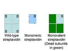 La streptavidine est un tétramère et chaque sous-unité lie la biotine avec une affinité égale. La multivalence est un avantage pour certaines applications, par exemple lorsque l'effet d'avidité améliore la capacité des molécules liées à la streptavidine à détecter des cellules T spécifiques[11]. Dans d'autres cas, tel que l'utilisation de streptavidine pour l'imagerie de protéines spécifiques dans les cellules, la multivalence peut perturber le fonctionnement de la protéine d'intérêt. La streptavidine monovalente est une forme recombinante de streptavidine tétramérique avec un unique site de liaison à la biotine fonctionnel. Ce site a une affinité de 10−14 mol/L et ne peut pas causer de liaison non spécifique[12]. Cette protéine est distribuée par l'université d'Oxford. Les applications de cette protéine incluent le suivi fluorescent de récepteur de surface cellulaires, l'identification de régions pour la cryomicroscopie électronique, la décoration d'origami ADN.
