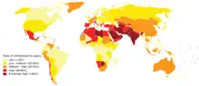 L'indicateur de Falkenmark[4] mesure quant à lui, les zones touchées par le « manque d'eau » selon la quantité d'eau disponible par habitant et par an (m3/hab/an).