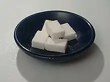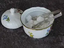 Le sucre en morceaux, parfois appelé pierres de sucre[1], est du sucre présenté sous forme de morceaux, le plus souvent des parallélépipèdes rectangles. Il est utilisé pour sucrer les boissons chaudes telles que le café, le thé ou les tisanes : la taille normalisée des morceaux permet d'apprécier la quantité de sucre que l'on met dans la boisson. À titre hygiénique, les morceaux de sucre peuvent être emballés individuellement pour la consommation dans les débits de boissons, les cantines, etc. La pince à sucre, autrefois répandue, permet de saisir un morceau dans le sucrier.
