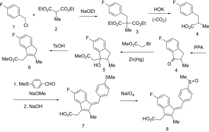 Le groupe méthylène actif est condensé avec du p-méthylthiobenzaldéhyde, en utilisant du méthoxyde de sodium comme catalyseur, puis saponifié pour donner 7 qui à son tour s'oxyde avec du métapériodate de sodium en sulfoxyde 8 qui est l'agent anti-inflammatoire sulindac.