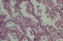 Dans les lavages alvéolaires de SDRA, on peut observer des Trichomonas, parasites unicellulaires flagellés[10]. Ces Trichomonas se présentent sous une forme amiboïde, sans flagelle, ce qui rend difficile leur identification sous le microscope[11]. La colonisation des espaces alvéolaires par le parasite est un phénomène secondaire, fréquent au-delà de J5, probablement favorisé par l'hypoxie locale du DAD. La transformation amiboïde est un argument en faveur d'une action délétère du parasite, qui reste néanmoins conjecturale.
