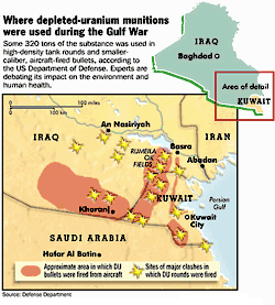Cette guerre a été la première à utiliser une grande quantité de munitions perforantes à uranium appauvri[41], ce qui a fait suggérer au début des années 2000 qu'une exposition à l'uranium pourrait être une cause possible du syndrome de la guerre du Golfe[42]. En 2008, une étude du département américain des Anciens Combattants n'a pas trouvé de lien de cause à effet entre l'exposition à l'UA et les pathologies multisymptomiques touchant les soldats. Il a conclu que « l'exposition aux munitions à l'UA n'est probablement pas une cause principale de maladie de la guerre du Golfe ». Mais des indices laissent penser qu'une exposition à long terme à des doses élevées d'UA peut causer d'autres problèmes de santé (sans rapport avec le syndrome de la guerre du Golfe)[14]. Puis alors que le temps passait, d'autres études médicales (reviews), plus récentes, ont conclu qu'au contraire, l'uranium semble bien impliqué : « le nombre d'anciens combattants de la guerre du Golfe ayant développé le syndrome de la guerre du Golfe après une exposition à des quantités importantes d'UA a grimpé à environ un tiers des 800 000 membres des forces américaines déployés", avec 25 000 ayant subi une mort prématurée »[43] ;