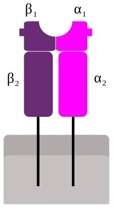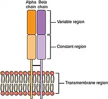 • Le site de fixation de l’antigène est composé de deux chaînes : alpha et beta, avec une partie variable et une partie constante. Ce site, à la différence du site antigénique des BCR, ne reconnaît qu'un type de molécule, les peptides, et à condition que ceux-ci soient présentés par un complexe majeur d’histocompatibilité (CMH). Cette complexité assure que l'organisme ne réagit pas contre ses propres peptides[9].