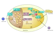 • l'hypermutation somatique (SMH) dans la zone sombre. Ce processus introduit des mutations ponctuelles dans la région v des immunoglobulines entraînant la production de cellule B d'affinité et de spécificité nouvelle