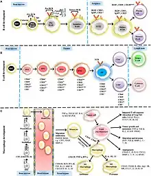 • Pre B où la chaîne lourde apparaît à la surface de la cellule. À ce stade, un premier contrôle est fait : les cellules n'ayant pas la chaîne lourde sont détruites par apoptose ;