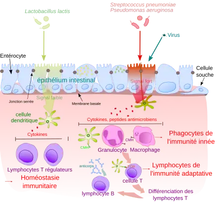 Schéma simplifié de l'homéostasie et de la réponse immunitaire au niveau de la barrière intestinale.