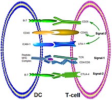Le deuxième signal implique le lymphocyte T auxiliaire CD4+ qui aura avant été sensibilisé aux mêmes épitopes présentés par une cellule dendritique. Le deuxième signal va être déclenché par la formation de la synapse immunologique décrite précédemment puis la libération de cytokine.