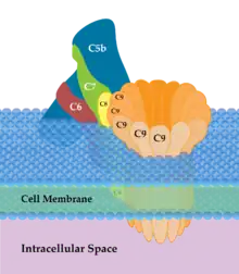 - ↑ Xie CB, Jane-Wit D, Pober JS, « Complement Membrane Attack Complex: New Roles, Mechanisms of Action, and Therapeutic Targets », The American Journal of Pathology, vol. 190, no 6, , p. 1138–1150 (PMID 32194049, PMCID 7280757, DOI 10.1016/j.ajpath.2020.02.006)