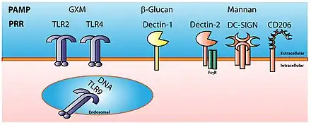 Les principales classes de PRR associées aux cellules identifiées sont les récepteurs Toll-like (TLR), les lectines de type C, les récepteurs peptidiques formylés Met-Leu-Phe, les récepteurs scavenger, les NLR et les protéines de la famille CARD.