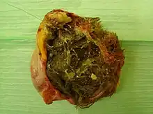 - Des tératomes ovariens peuvent produire des poils ou des dents à l’intérieur des ovaires, et éventuellement être associés à un goître[17].