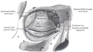 Le tarse (tarse palpébral[1]) est une lamelle de tissu conjonctif dense (en) située dans la paupière, contribuant à la forme et au soutien de cette dernière[2]. Sa longueur est d'environ 2,5 cm.