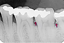 - le tartre sous-gingival : c'est le tartre qui s'est déposé sur la racine de la dent, à l'abri de la gencive, au niveau des poches parodontales. Il est souvent beaucoup plus foncé. Ce tartre est le plus dommageable : les bactéries sont protégées à l'intérieur de la poche, et progressivement la flore aérobie se transforme en flore anaérobie, plus pathogène. Par ailleurs, comme on ne le voit pas, on ne s'en rend pas compte.