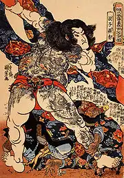 Au Japon, des figurines datant de l'ère Jōmon portent des symboles ressemblant à des tatouages, mais aucune étude scientifique n'a pu mettre au jour des preuves concrètes attestant de ces pratiques. Les premières traces connues sont issues d'écrits chinois datant du IIIe et VIe siècles. Ces textes parlent de pêcheurs dont le corps est entièrement recouvert de tatouages[23],[24]. Dans le Kojiki, écrit en 712, il est décrit deux différents types de tatouages, un considéré comme « prestigieux » pour les personnes illustres, les héros et les nobles, et un plus « vulgaire » pour les criminels et les bandits.