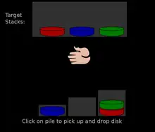 Sur le plus grand piquet on peut insérer les trois boules, sur le moyen, deux boules et sur le petit piquet, une seule boule. Les boules peuvent ainsi être arrangées sur les piquets de façon à former différents modèles (cf."Target Stacks" sur la figure 2)[1].