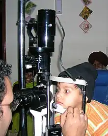 Une inspection approfondie des structures oculaires antérieures est souvent effectuée avec une lampe à fente, un microscope monté sur table avec une source d'éclairage réglable. Un petit faisceau de lumière dont la largeur, la hauteur, l'angle d'incidence, l'orientation et la couleur peuvent varier est passé au-dessus de l'œil. L'examinateur visualise les structures oculaires éclairées, le patient étant assis avec la tête stabilisée par une mentonnière réglable.