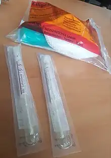 - Prélèvement - Identification du patient, prélèvement nasopharyngé avec un écouvillon[27] (à ne pas confondre avec le prélèvement nasal, moins profond, utilisé pour certains tests antigéniques[28]) ou prélèvement oropharyngé avec un écouvillon par la bouche jusqu’à l’arrière-gorge (oropharynx)[29] ou prélèvement salivaire au moins 30 minutes après avoir mangé et bu (en crachant dans un tube ou prélevé sous la langue soit en plaçant un écouvillon pendant une minute, soit avec une pipette)[30],[31], puis conditionnement de l'échantillon sous triple emballage. Ce prélèvement peut être fait par les laboratoires de ville, les services des hôpitaux, ou même les médecins de ville, à condition de disposer du kit de prélèvement. Certaines procédures prévoient de prendre deux échantillons pour chaque prélèvement. Durée : 5 à 15 minutes. À partir de la mi-, on autorise des prélèvements par la salive mais ceux-ci sont en 2021 limités à des contextes très précis : milieux-scolaires ou médicalisés et assez peu diffusés devant la réticence des laboratoires[32].