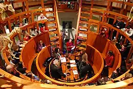 Gravure de 1612 représentant le théâtre anatomique de Leyde avec des squelettes humains et animaux dans les gradins prévus pour le public.