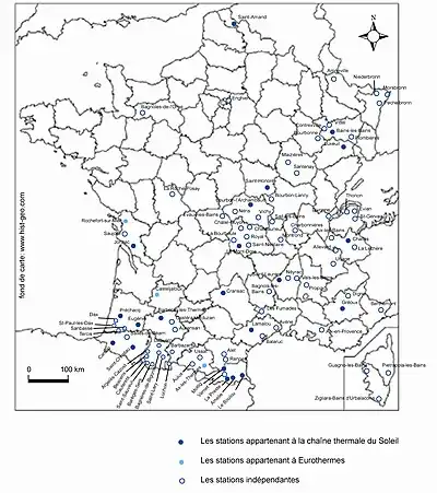 En 2016, il existe en France 109 établissements implantés sur 89 sites spécialisés dans au moins une orientation thérapeutique (la rhumatologie est la plus courante). Dax compte le plus grand nombre d'établissements. Plus de 500 000 patients effectuent une cure chaque année en France.