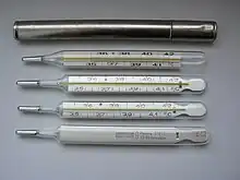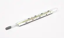 Le thermomètre à mercure a été inventé par Gabriel Fahrenheit en 1724[1]. Son fonctionnement repose sur du mercure contenu dans un tube de verre. Le volume du mercure, donc la longueur de la colonne dans le tube, est fonction de sa température. On peut lire cette dernière grâce à des graduations inscrites le long du tube. Pour augmenter la sensibilité du thermomètre, une ampoule plus large que le tube est formée à l'une de ses extrémités et remplie de mercure ; les petites variations de volume du mercure se traduisent alors par de grands déplacements de l'extrémité de la colonne. L'autre extrémité du tube est remplie d'azote, à une pression plus faible que la pression atmosphérique.