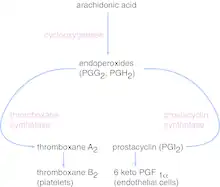 Elles sont produites dans les thrombocytes[1] (plaquettes) par la thromboxane-A synthase à partir des endoperoxydes, les prostaglandines, elles-mêmes produites par des cyclooxygénases (COX, ou plus précisément la prostaglandine H2 synthase qui possède un domaine COX, appelé ainsi pour Cyclo-OXygénase) à partir de l'acide arachidonique (arachidonate).