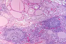 En microscopie les lésions consistent en une association de fibrose interstitielle, d'infiltration lymphoïde et de destruction épithéliale[1],[2]. Le degré de fibrose est très variable[1]. L'infiltration lymphoïde présente une organisation en follicules avec des lymphocytes B au centre et des lymphocytes T dans le cortex[2]. Les cellules épithéliales thyroïdiennes sont également modifiées, apparaissant élargies et acidophiles (cellules de Hürthle)[2].