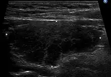 L'échographie de la thyroïde montre un goitre hypoéchogène[20],[18]. Le parenchyme thyroïdien devient plus hétérogène au cours de l'évolution. On peut notamment mettre en évidence des pseudo-nodules et des nodules de régénérations hyperéchogènes (white knight)[18]. Des ganglions récurrentiels peuvent être visualisés[18]. La vascularisation est hétérogène en Doppler couleur. L'étude en Doppler pulsé retrouve une élévation des vitesses systoliques[18], toutefois moindre que dans la maladie de Basedow.