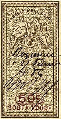 - ↑ Catalogue des timbres fiscaux et socio-postaux de France et de Monaco, Amiens, Yvert & Tellier / Itteville, Société française de philatélie fiscale, 2016 (ISBN 978-2-86814-260-3), p. 7.