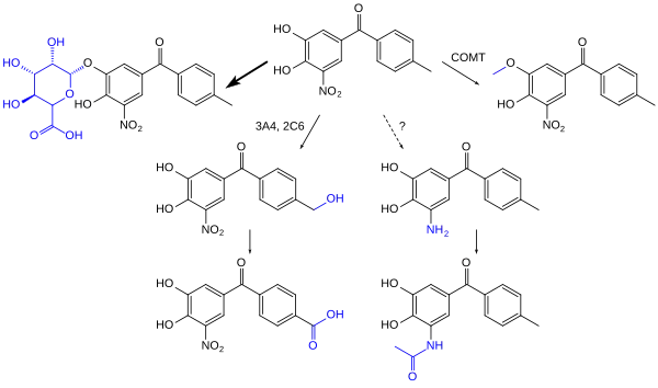 - ↑ Forsberg, Lehtonen, Heikkinen et Savolainen, « Pharmacokinetics and Pharmacodynamics of Entacapone and Tolcapone after Acute and Repeated Administration: A Comparative Study in the Rat », Journal of Pharmacology and Experimental Therapeutics, vol. 304, no 2, , p. 498–506 (PMID 12538800, DOI 10.1124/jpet.102.042846)
