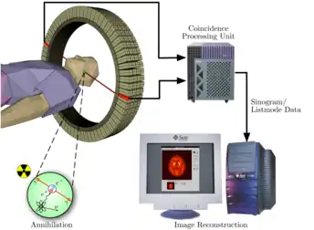 Une caméra TEP est un appareil qui a l’aspect d’un scanner mais son principe de fonctionnement est différent. En effet, l'atome radioactif (par exemple, le fluor 18) se désintègre en émettant un positon. Celui-ci va s'annihiler avec un électron du milieu, après un très court parcours de l'ordre du millimètre (0,6 mm dans l'eau pour le positon du 18F). Cette annihilation produit deux photons gamma de 511 keV qui partent sur une même direction mais dans un sens opposé, ce qui rend possible le traitement tomographique des données. En effet, les capteurs situés tout autour du patient détectent les photons d'annihilation en coïncidence (c’est-à-dire ceux qui arrivent en même temps), ce qui permet d'identifier la ligne sur laquelle se situe l'émission des photons. Un système informatique reconstitue ensuite à l'aide d'un algorithme de reconstruction les images de la répartition du traceur au niveau d’une partie ou de la totalité du corps sous la forme d'une image 2D ou d'un objet 3D. Les images ainsi obtenues sont dites « d’émission » (la radioactivité provient du traceur injecté au patient). La résolution spatiale de l'image ainsi obtenue est comprise entre 4 et 7 mm en imagerie clinique (pour l'homme) et inférieure à 1,5 mm en imagerie préclinique (destinée au rat ou à la souris)[7].