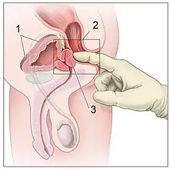 Chez l'homme, le toucher rectal permet en outre l'analyse de la prostate. Lorsqu’elle est normale, elle a une consistance souple et régulière, et elle est constituée de deux lobes séparés par un sillon médian. En cas de prostatite, la prostate est douloureuse ; en cas d’abcès (situation très rare), elle est molle. En cas d’hypertrophie bénigne de la prostate, elle peut être anormalement grosse et perdre son sillon médian mais elle conserve un aspect régulier et homogène. En cas de cancer de la prostate, un nodule peut être présent, ou au maximum un aspect figé du pelvis en cas d’envahissement important. Dans ces cas, la prostate est irrégulière et pierreuse.