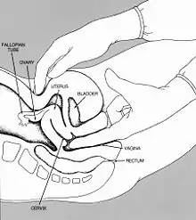 Il est fréquent de compléter ce toucher par une palpation abdominale de l'autre main, afin d'apprécier la taille et la position de l'utérus.